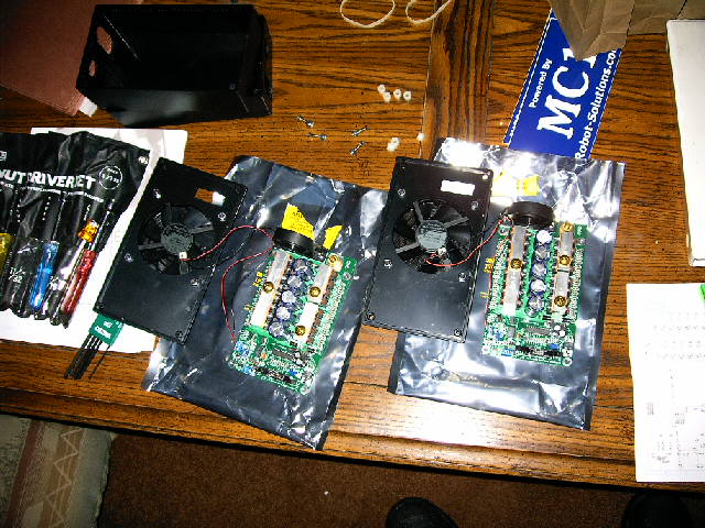 | Of course, before I could start drilling holes in the enclosures and mounting plate, I had to liberate the circuit boards. This picture shows the creamy centers of the speed controllers carefully nestled on static-bags while I worked on the mounting issues. It's a little nerve-wracking pulling these things apart, but they seem to be really well built. I guess if they can survive combat, they should be just fine being lovingly lifted out of their protective boxes. |