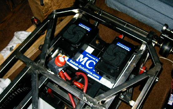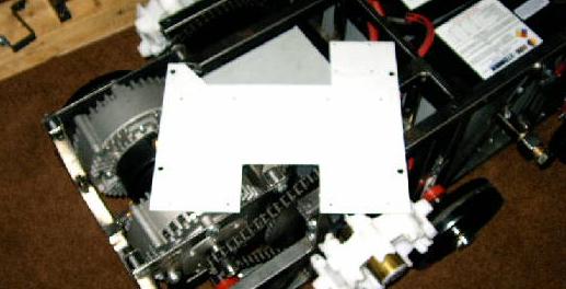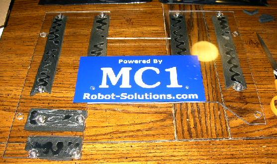 | I peeled the protective paper off of the mounting plate, slapped a Robot-Solutions sticker on it, glued nuts into the mounting holes, and glued on strips of mouse pad to provide some shock absorption. I would usually wait until a company had really proved itself to me before I put it's name on my robot, but I made an exception for two major reasons. First, David Moeller has really impressed me with his quick, informative, and patient responses to my incessant questions. Second, this mounting plate was designed specifically for these controllers, so if they do blow up and I decide I don't like them anymore, I won't use this plate anymore either, so the whole thing will be moot. |