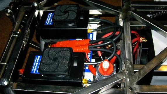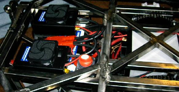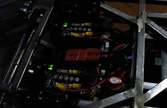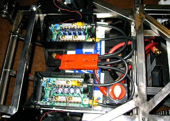 | Here the controllers are wired to the batteries. With this all set up, I get to actually turn them on for the first time. I just throw the master power switch, and the fans hum to life, letting me know that I haven't accidentally grounded anything that wasn't supposed to be grounded or anything. I can get pretty stupid when it comes to wiring, so these kinds of validations are really nice. |