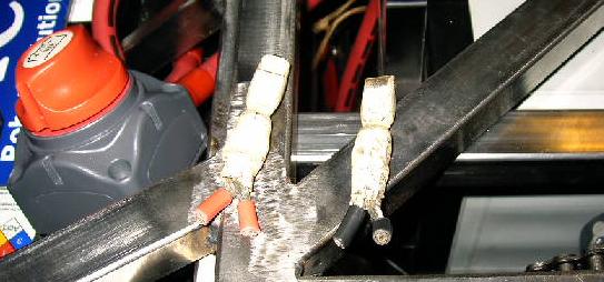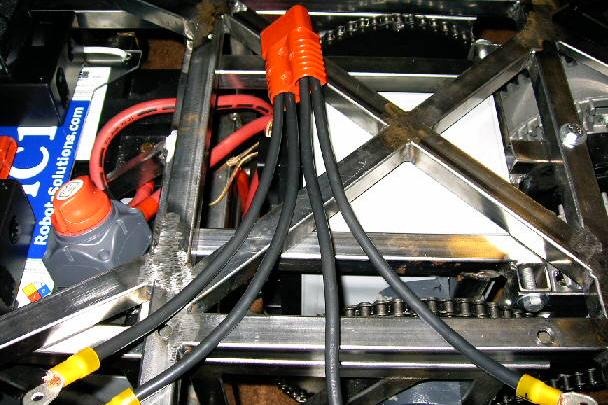 | Because there just wasn't enough wiring crammed into that rat's nest, I got to work wiring the motors up. To start off, I'm going to continue to use the long 8 gauge wire, which is significantly undersized for the application. The idea is that this will add a bit of resistance and inductance to the motors, making things easier on the controllers, but slightly less efficient. Worst case scenario, we'll have heat problems and need to beef it up, which is no big deal. Well, actually, worst case scenario is that we have enough heat problems to start a fire. Even so, it'd probably just destroy the wires and that would be the end of it. |