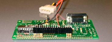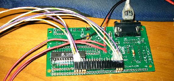 | Here, I've added several things. The easiest to see is the PAK-V PWM Coprocessor itself, which is plugged into the socket (no solder). Another important component is the small yellow bit up from the middle of the board. This is the ceramic resonator, and it will provide the clock pulses (with capacitance built in) to the chip. Also here are a lot more jumpers and the male headers that I will plug the external wires to. Later, we find out that the locations of one of the groups of headers is one off (I'm almost sure the documentation is flawed, but it's always possible that it was my mistake), but we don't know that at this point. |