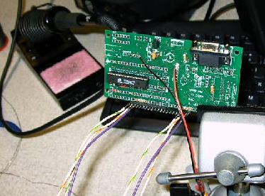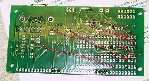 | This is a picture of the back of the board. Here, you can see the majority of the jumper wires that I soldered. This board is a universal integrated circuit (IC) interface, so if you want to use it for a custom application, you have to sort of make do with what you have. This is essentially equivalent to adding a third layer to the circuit board with these wire traces on it, but much cheaper, and a lot bulkier. Looking at this picture, I can actually see the wire traces not lining up right on the pins that are soldered in the wrong place (bottom middle, three pin header, for those of you that are curious). |