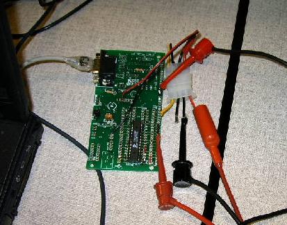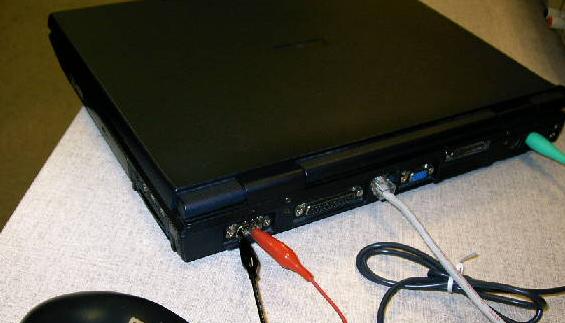 | Now that it seems to be more or less together, it's time to play with it a bit. Unfortunately, the wiring is a bit sketchy, as you can see here. I've clipped a pair of tiny alligator clips to the data and ground pins on my laptop. Hopefully they won't short to anything. |