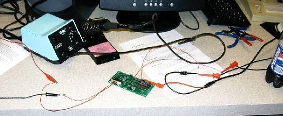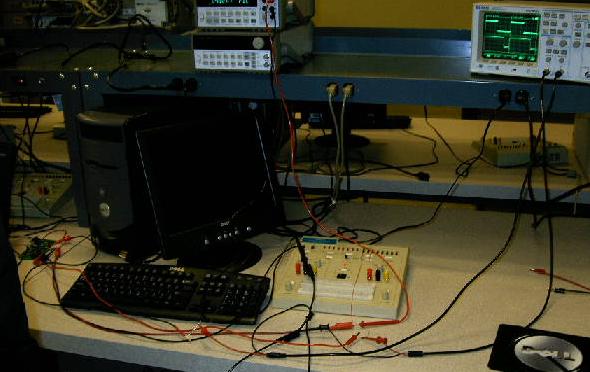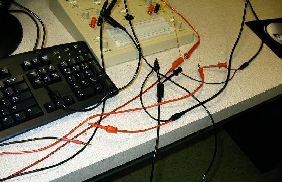 | The next day we set everything back up and got back to work. Here you can see the new, improved wiring setup. The board is right next to the laptop because we're using my homemade two-pin serial cable (which is about four inches long). We also have a power supply hooked up and the circuit output and input are being monitored by the oscilloscope and the digital multimeter. |
