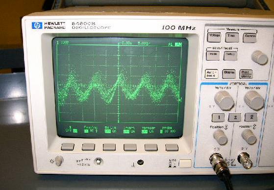 | Here's the initial oscilloscope reading. That is nothing but line noise. We've got long leads running from the scope to the board, so they're picking up a lot of cross-talk and other wayward signals. The horizontal grid lines are in divisions of (I think) 0.01 volts, so this is nothing to be alarmed at. |