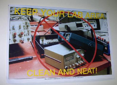 | This poster has been hanging on the wall of the electrical engineering lab at Cogswell for at least the four years I've been going there, and we've always joked about it. It's supposed to show a messy workstation as an over-the-top example of how not to do things, and the station is just not that messy. It looks like someone just stacked a few devices up and took a picture -- there aren't even any wires. |