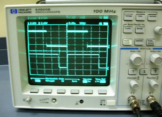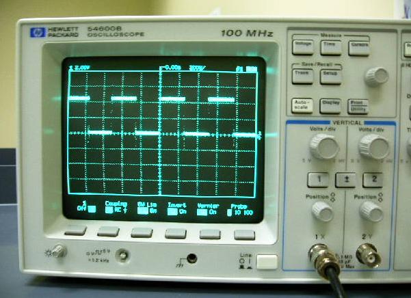 | And here's what we wanted it to look like. That's a nice square wave, and the y-axis is now set at 2-volt divisions (making this wave just shy of 5V). There's only one problem: we told it to do about a 10% duty-cycle, and that's closer to 60%. Christina tinkered around with the thing for a bit, and found a small bug in the code that encoded commands before it sent them out. It was easily fixed, and we were back in business with much more reasonable values. |