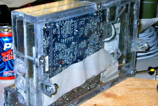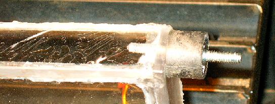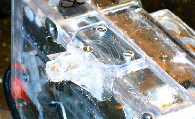 | With that all wrapped up, it's time to get back to the computer enclosure mounts. Here you can see that both of the lower mounting points have pulled off. It's happened twice, actually. The first time I upgraded to a stronger glue and cut grooves into the surfaces, but that didn't work. Now it's time to get serious. |