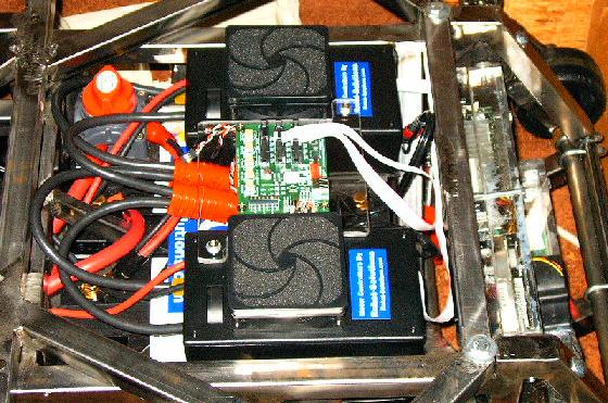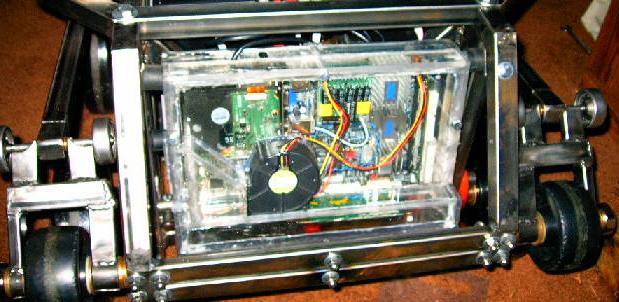 | And here's where I'm left after the past few day's work. It's starting to look pretty good. I still have to modify the Lexan top plates to accommodate the new members, but that's not top priority until I want to start driving around in the rain. Now all I really need is to update the software to communicate with uMOB2 and we should be ready to start driving around again. |