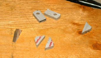 | Now it's on to the bottom mounting points. This little pile of Lexan bits is my first shot at a solution. These will assemble into little angle brackets and be glued onto the back of the computer enclosure. |