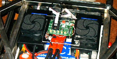 | And here it is on the robot. You can see how the fans stick up into the new little pocket and how everything fits together. It's still a little tight (the USB plug pushes against one of the new members, putting a bit of stress on the uMOB2 board), but I can live with it. |