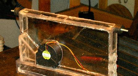 | And here's how it will fit inside the robot. Two screws hold the acrylic plate to the speed controller lids, suspending the uMOB2 in the small gap between the cooling fans. |