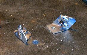 | Here's what I came up with for the top anchor points. They don't look like much, but they were a lot of work. I cut short strips of steel strap, bent them, checked them against the chassis, trimmed them to fit, marked the hole locations, drilled, and welded the weld nuts into place. They sure are ugly little brackets, but where they're going to live, no one will ever see them. |